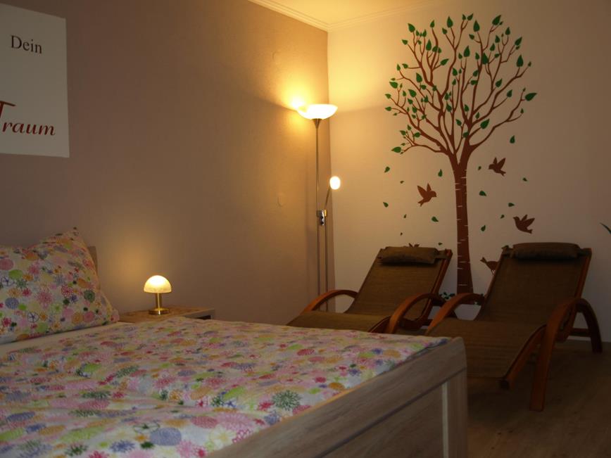 Schlafzimmer mit Doppelbett und Relax-Ecke